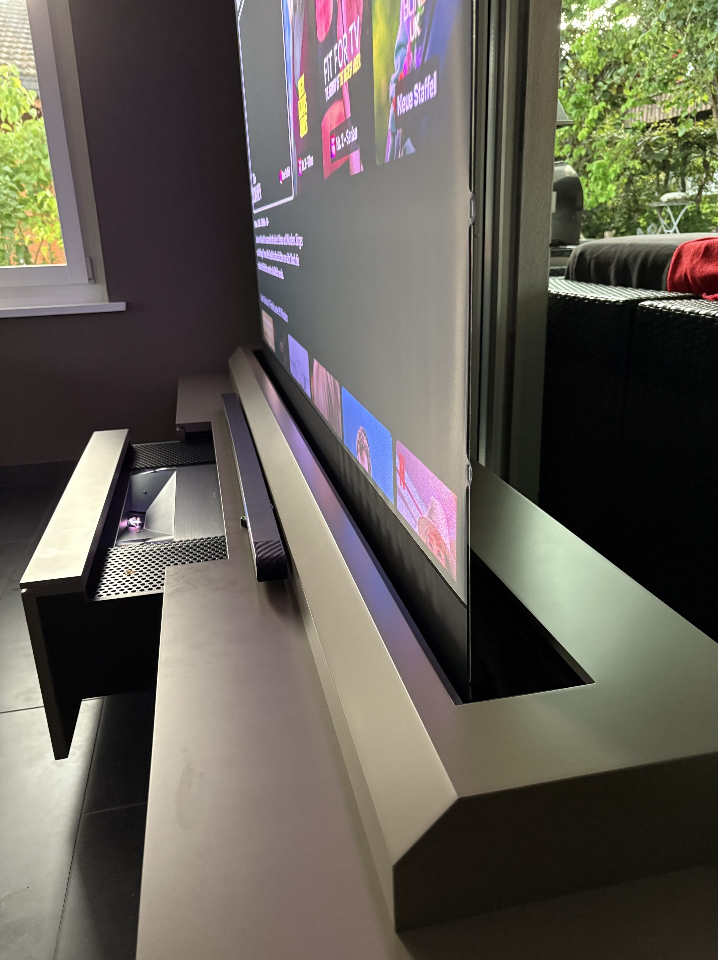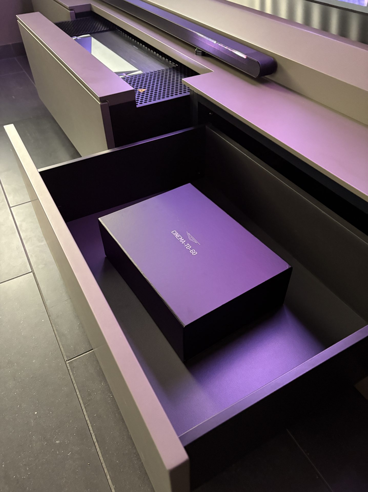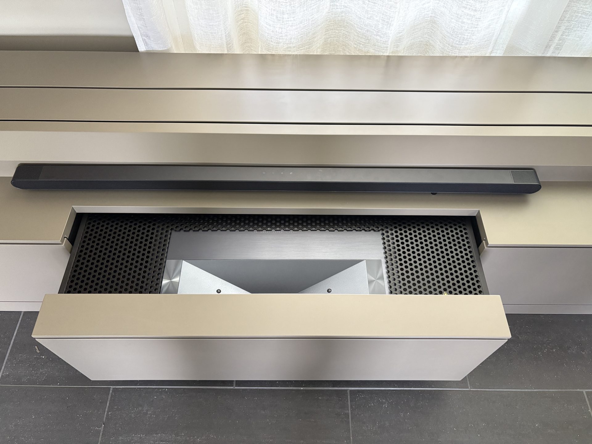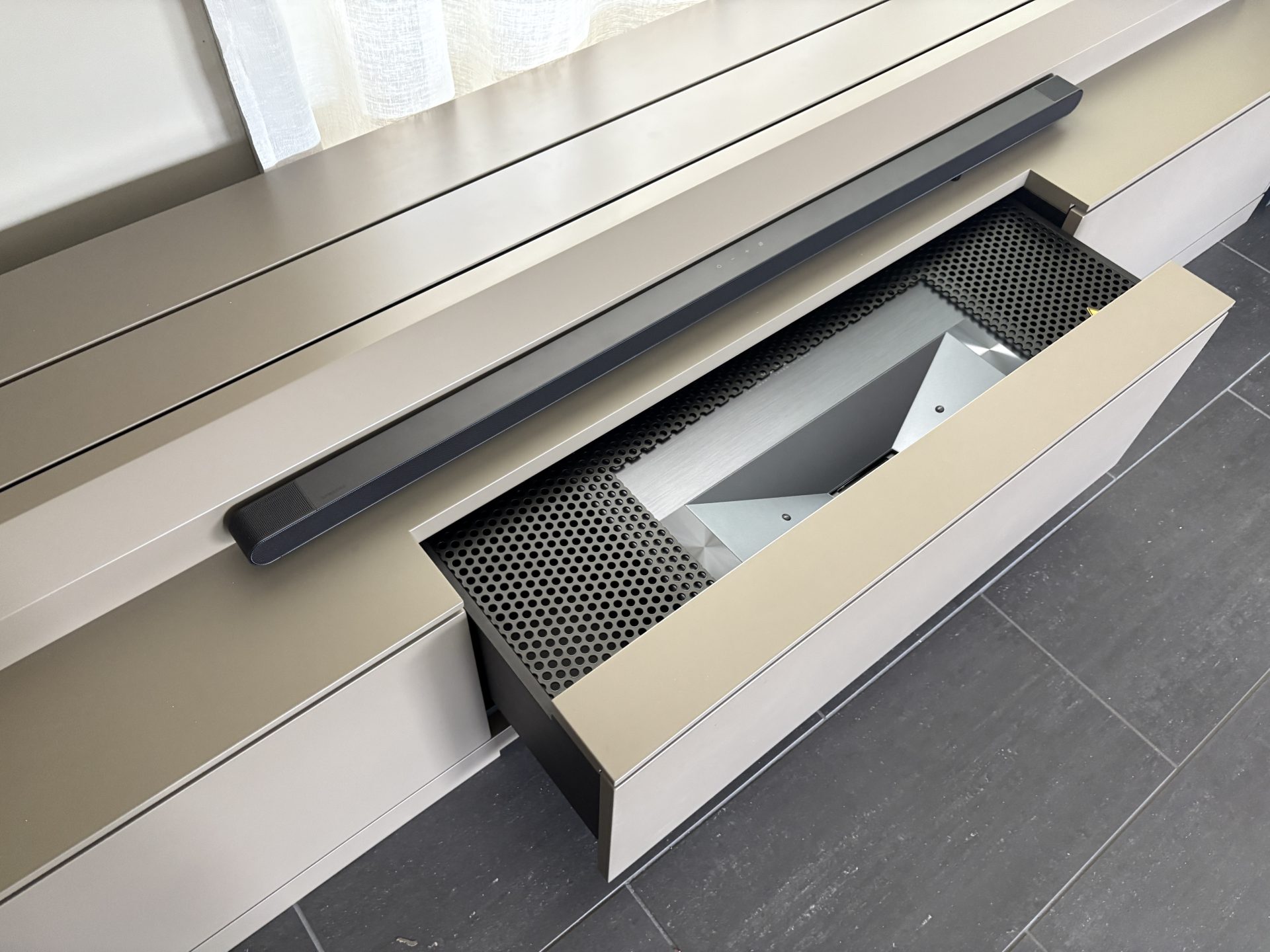 Die mittlere Schublade ist für das Laser Cinema reserviert. Dort befinden sich auch Steckdosen für den Anschluss von IPTV-Boxen.