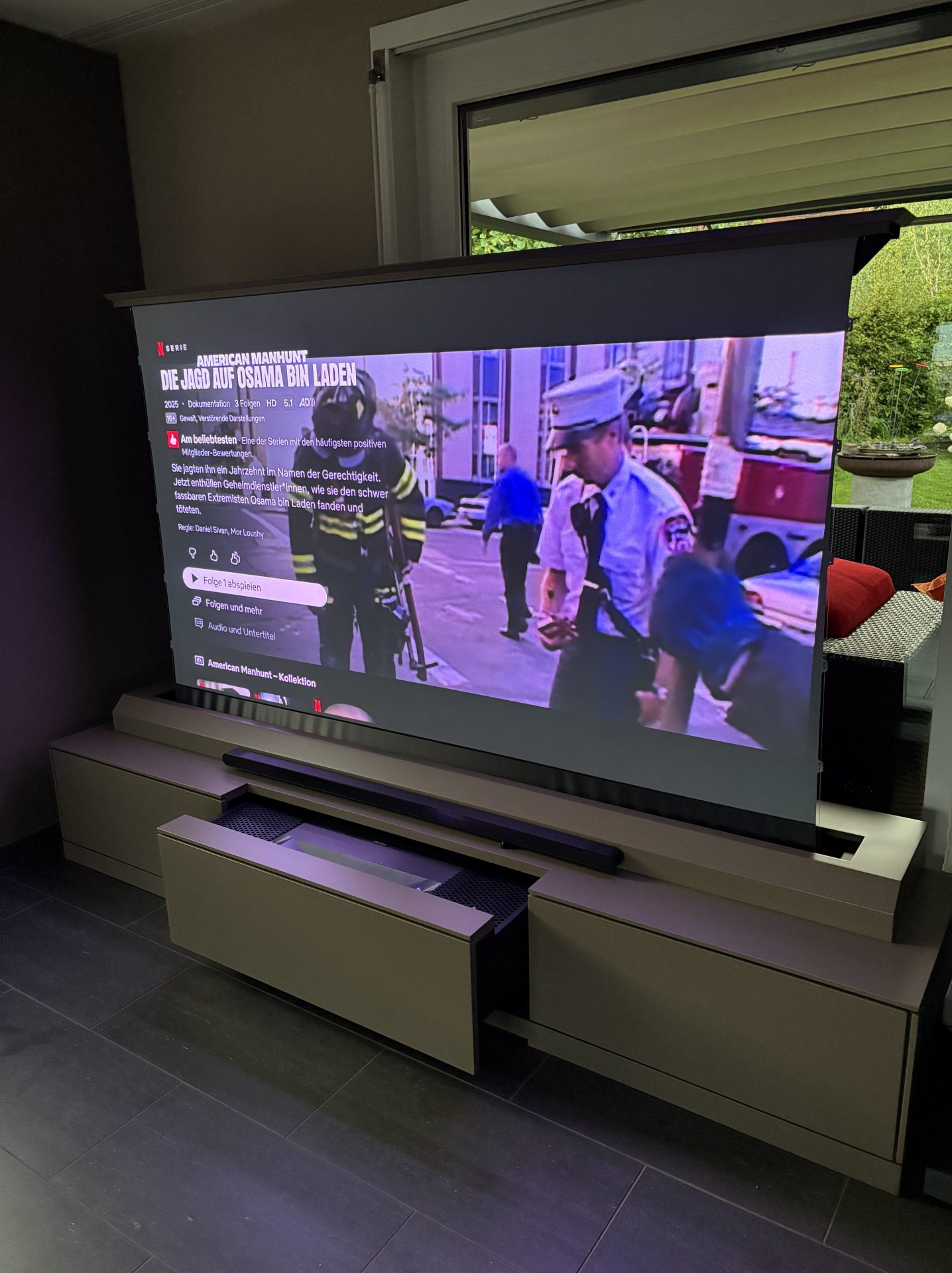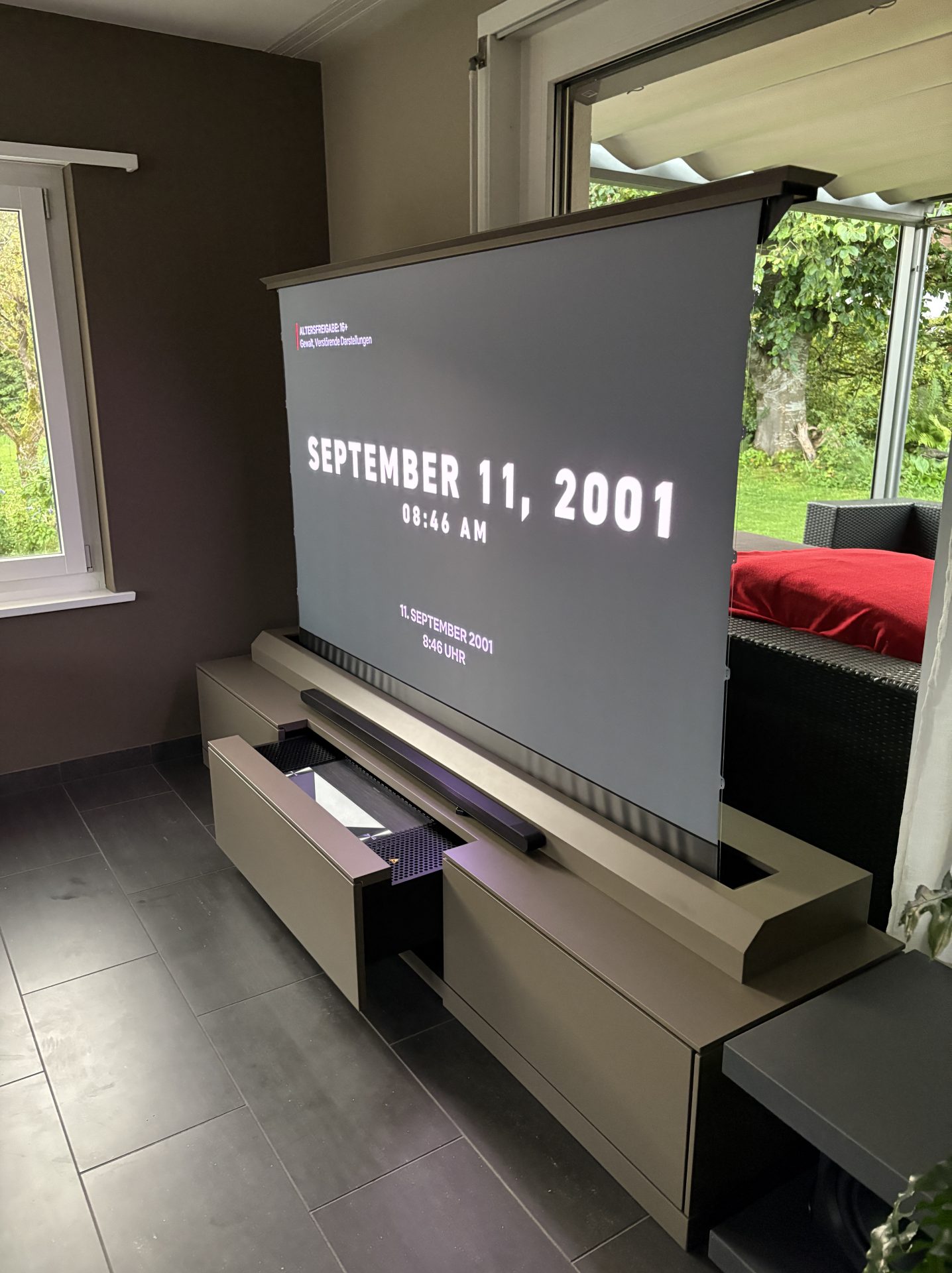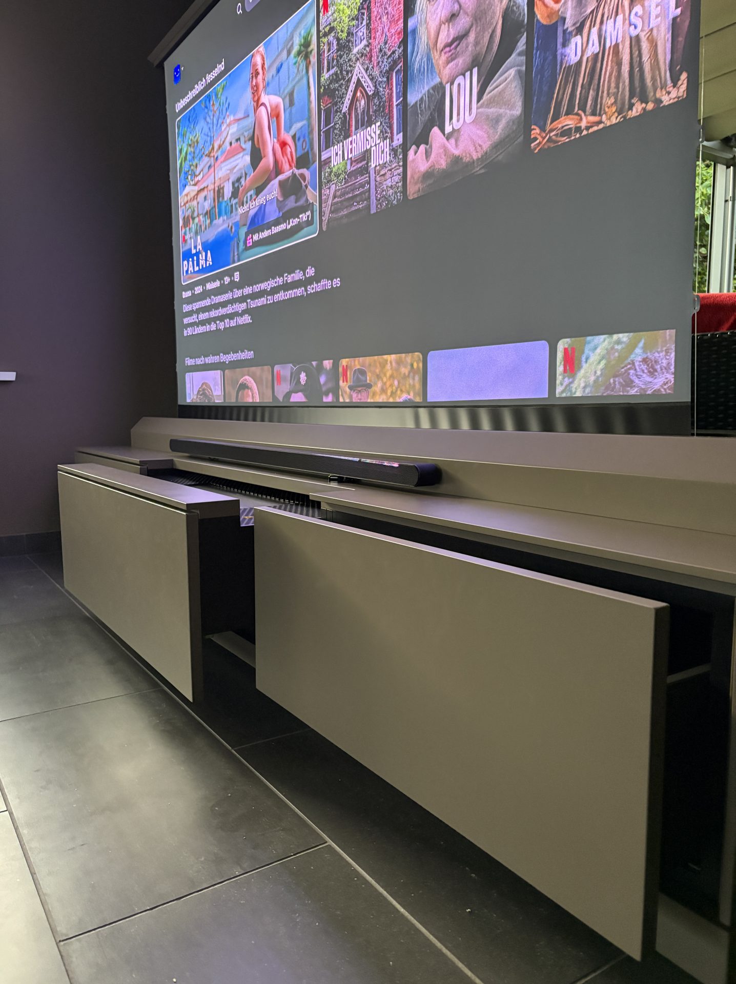 Im zentralen Teil des Möbels ist das Heimkino elegant verborgen. Per Knopfdruck entfaltet sich die Technik: Ein leistungsstarker Laserprojektor, eine automatisch ausfahrbare Leinwand und ein spektakuläres Soundsystem schaffen ein einzigartiges Heimkino-Erlebnis – ganz ohne sichtbare Technik im Ruhezustand.