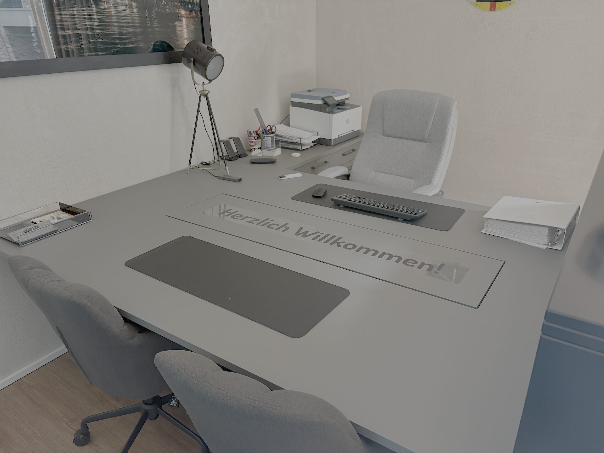 Viel Platz für Meetings mit Kunden oder Kollegen – und wenn konzentriertes Arbeiten gefragt ist, fahren zwei Monitore geräuschlos auf Knopfdruck hoch.